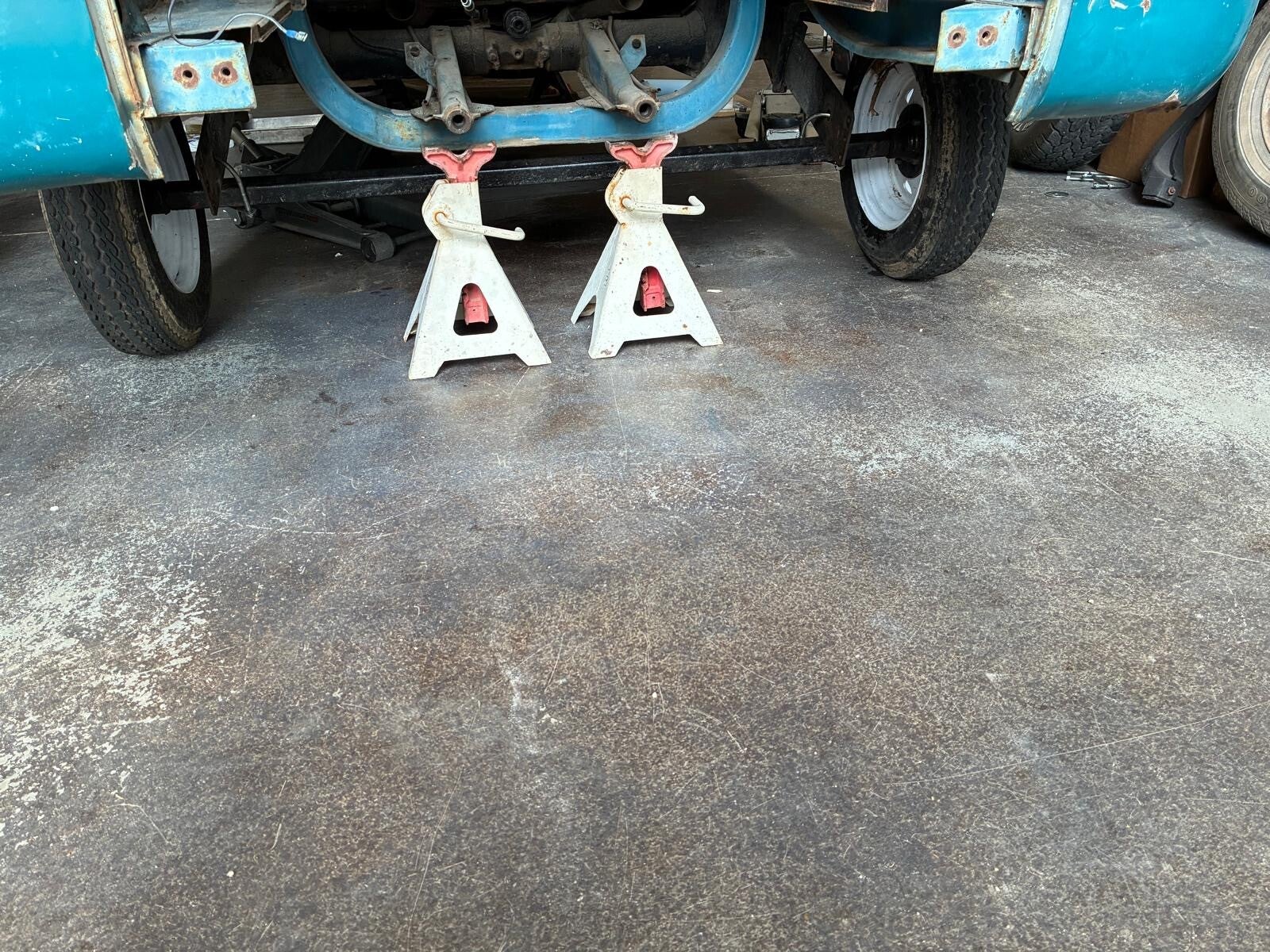 David Pedrosa pulled the transaxle out from under the bus this morning. Made it look easy. Mike brought over what we hope is a good one from his stash. Doesn’t everyone have a spare transaxle in the parts shed? Thanks Mike. Mike also found a trailer axle and we spent a little time this afternoon getting it in place. I’ll finish that up tomorrow hopefully.